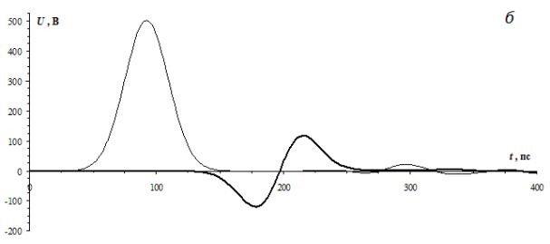 Рис. 3. Формы сигналов на входе подключаемой линии (–––) и на конце внешних проводников ( ) при ширине спектра воздействующего сигнала 0–2,3 ГГц (а) и 0–20 ГГц (б)