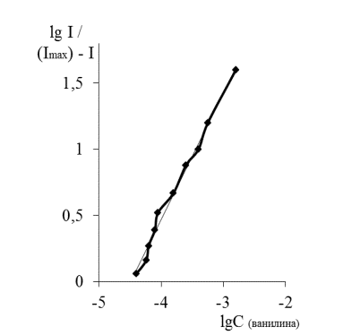 Интенсивность люминесценции сорбата комплекса Тb(III) – Ван пропорциональна концентрации Ван в широком интервале 10–6 – 10–2 моль/ л, что позволяет сделать вывод о том, что указанный сорбат комплекса может быть использован в качестве аналитической формы для определения ванилина.