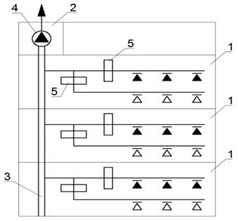 1 – ярусы (этажи), помещения для хранения автомобилей; 2 – венткамера; 3 – шахта, вертикальный коллектор; 4 – вентилятор совмещенной системы/двухскоростной; 5 – противопожарные нормально-открытые клапаны.