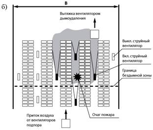 Рисунок 2 – Работа струйной вентиляции в штатном (а) и аварийном (б) режимах