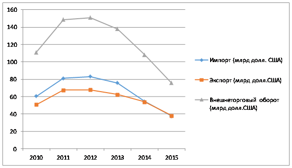 2015 г. общий внешнеторговый оборот стал меньше в 2 раза по сравнению с 2012 г.