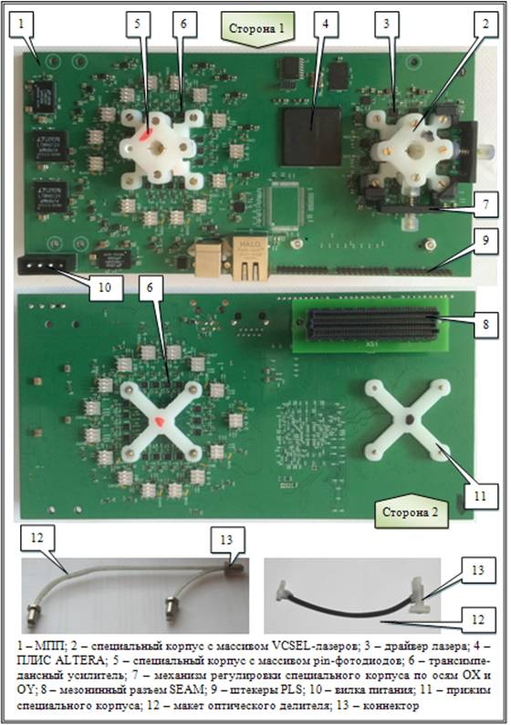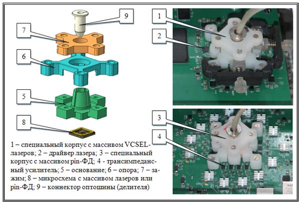 Основными элементами приемо-передающего модуля являются двумерный массив из 8-и VCSEL-лазеров и двумерный массив из 29-и pin-фотодиодов, установленные в специальных корпусах в зонах передатчика и приемника соответственно (рисунок 3).