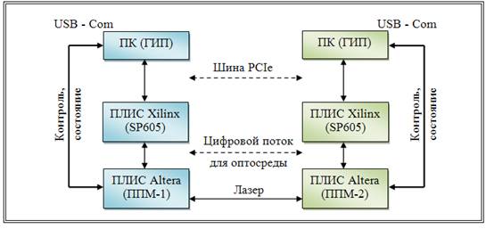 Устройства управления ЭО ПСС реализованы на основе комбинации ПЛИС, поддерживающих PCIe с одним двунаправленным последовательным соединением Lane. На рисунке 5 показаны элементы устройства управления одного приемо-передающего модуля ЭО ПСС. Второй приемо-передающий модуль содержит аналогичное устройство управления.