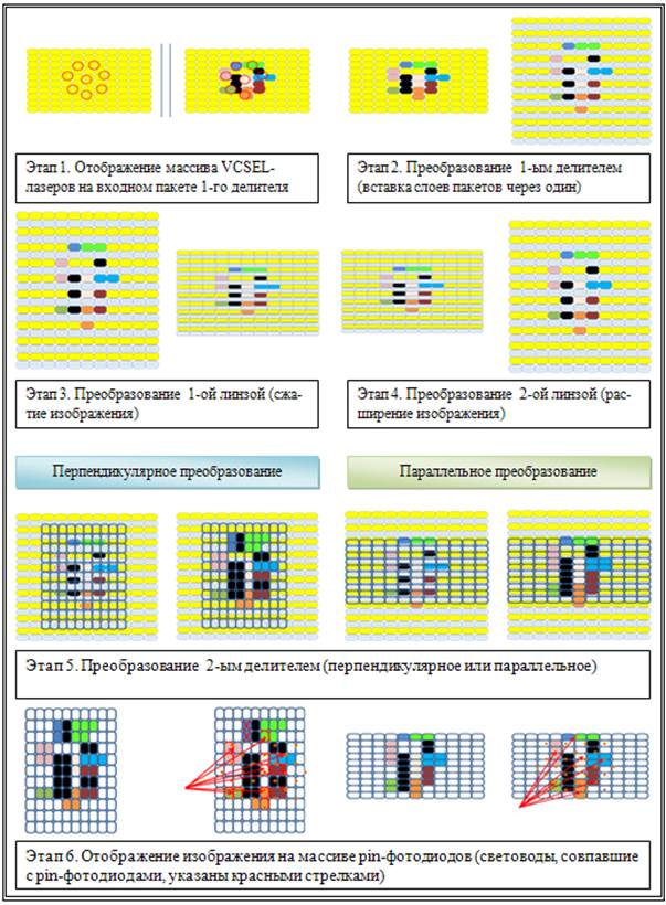 На рисунке 7 показаны этапы и соответствующие им схемы преобразования изображения в оптической системе (вариант оптимизированной схемы полнодуплексного “смартлинк соединения” с двумя оптическими многоканальными делителями сигналов).