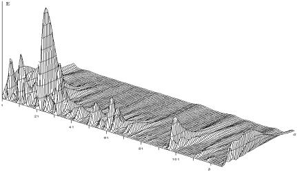 осцилляций, т.е. обратен частоте, а второй b – аналогичен смещению сигнала по оси времени. Спектр W(a,b) одномерного сигнала S(t) представляет собой поверхность в трехмерном