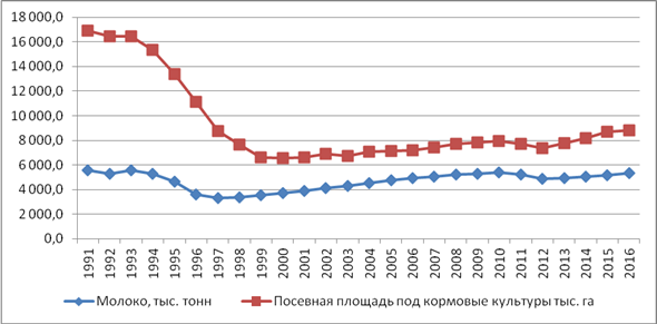 1 – Динамика производства молока (тыс. т) и посевных площадей под кормовые