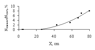 Fig. 1 - Distribution of the concentrations ratio of optically non-active and active oxygen atoms along the length of a silicon single crystal