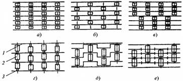 кольцевая; б – в шахматном порядке; в – кольцевая в пол ряда; г – с перекрытием с дистанционными