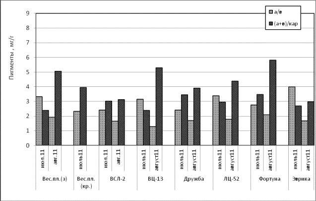 соотношения «хлорофиллы/каротиноиды» до 5 единиц и более, отмеченное для
