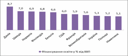 фінансування освіти припадає на Скандинавські країни: Данію – 8,7 % ВВП,