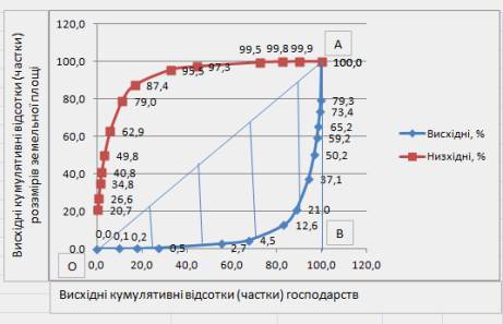 (рис.1). Величина коефіцієнту Джині розрахована для даного прикладу дорівнює 0,84,