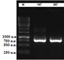 Note: 1,2 – bacterial samples; M – molecular mass marker O'GeneRuler 1 kb