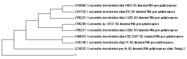 Search of homologous nucleotide sequences of 16S rRNA genes by the program BLAST (Basic Local Alignment Search Tool) in the International database Gene Bank of the National center for biotechnology information, USA (htpp://www.ncbi. nlm. nih.gov) showed the identity of the studied strain to the species Leuconostoc mesenteroides (99% homology).