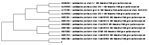 Search of homologous nucleotide sequences of the genes 16S rRNA by using the program BLAST (Basic Local Alignment Search Tool) in the International database Gene Bank of the National center for biotechnology information, USA (htpp://www.ncbi. nlm. nih.gov) showed the identity of the studied strain to the species Lactobacillus plantarum (100% homology).As can be seen from the phylogenetic tree, nearest-neighbor strain is Lactobacillus plantarum HUMBO7393.