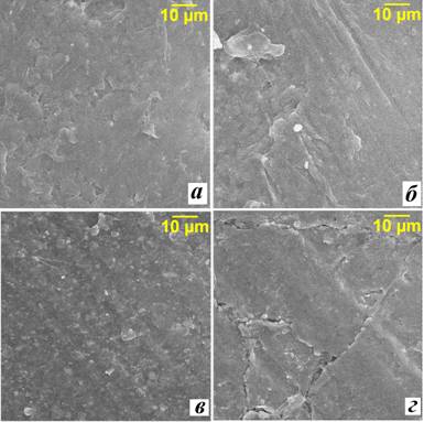 поверхности: а –ПТФЭ, б – Cu на ПТФЭ, в – резина, г – Cu на резине