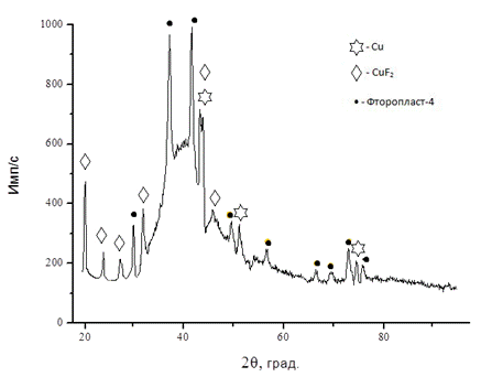 На рис.3 представлена дифрактограмма образца ПТФЭ с термонанесением меди. Рентгенофазовый