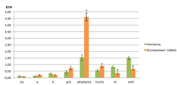 контрольна група та експериментальна група з блокатором L-NNA. Кожна група мала по десять тварин. В наших дослідженнях