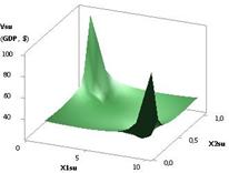 последних рисунках 23 и 24 представлены 2D и 3D зависимости Vsu (GDP), когда переменные были следующими: Х1 = Х2 = 1…10, Х2