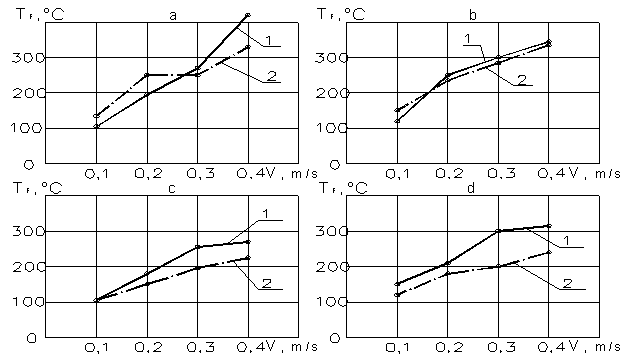 0,1 m/s; b - 0,2 m/s; c - 0,3 m/s; d - 0,4 m/s (1, 3 – in the air; 2, 4 – in