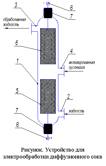 электрообработки диффузионного сока предложено следующее устройство (рисунок), включающее
