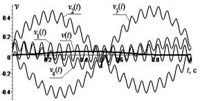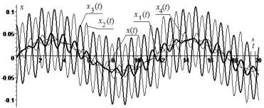 м/с2. Получаются новые решения, синфазность которых можно наблюдать у перемещений x2(t), x3(t) и на графиках рисунка 3.