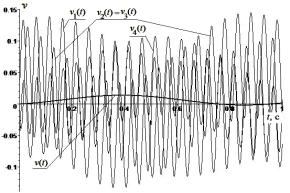 находятся в противофазе по гармоническим колебаниям с собственной частотой l1 = 5.94 рад/с, что можно наглядно наблюдать на графиках рисунка 2.