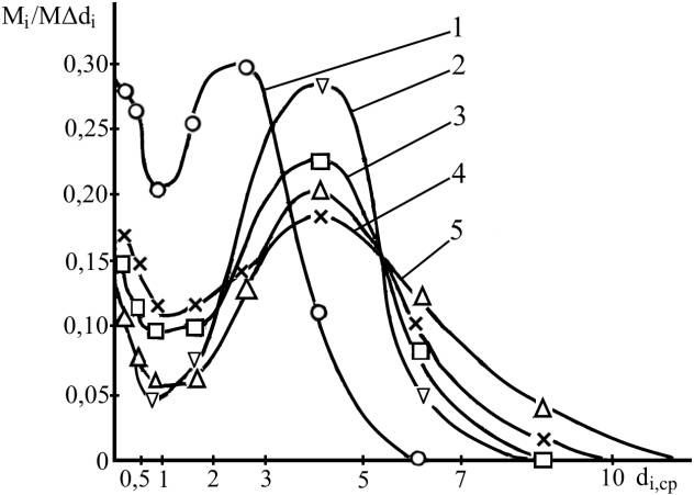 более мелких фракций. При постоянном значении ω (кривые 2, 3,