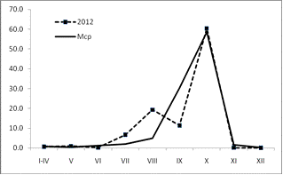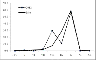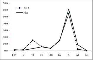 1. Сезонное распределение опада листьев дуба (по вертикали удельный вес, %; по