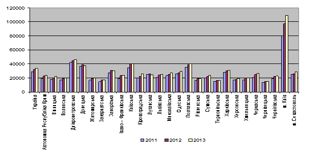 динаміку ВРП України в розрізі регіонів на душу населення за 2011 – 2013 рр.[2]