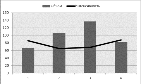 Сказанное иллюстрирует график рисунка 5, на котором параметрическая нагрузка отличается от графика нагрузки представленного ранее на рис. 4, тем, что отображает отдельно интенсивность рывка и толчка, а динамика объема относительна изменению интенсивности.