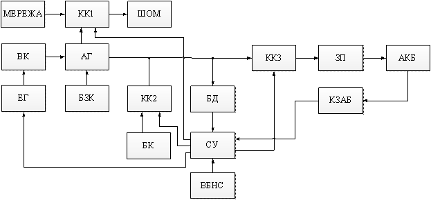 мережа; КЗАБ – контролер заряду акумуляторної батареї; АКБ – акумуляторна