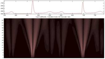 пациента, снизу непрерывное вейвлет-преобразование этого сигнала.