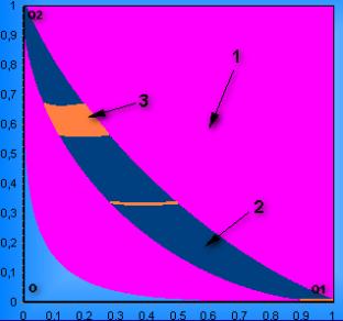 - область устойчивости в линейном приближении; 2 – устойчивость; 3 –