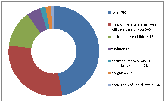 love – 72%, interested marriage – 4%, based on common religion – 7%);