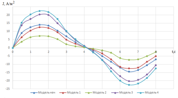 индукции наблюдаются у модели 4. Самые малые максимальные и минимальные