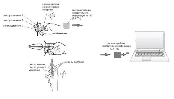 представлена структурная схема прибора с местами размещения сенсоров (сенсоры