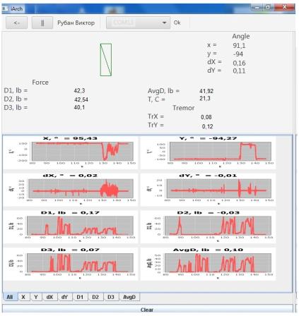Данные полученные с каждого датчика (каждые 10-15 млсек) отображаются в цифровой форме и в виде графиков в визуальной форме. В программе предусмотрена запись всех показаний сенсоров в файл с расширением .txt с последующей возможностью обработки и графической визуализации для каждого отдельно спортсмена.