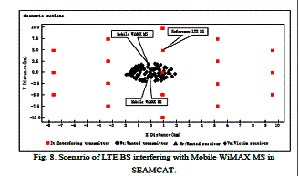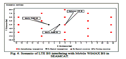 Макро-сотвая модель распространения; Когда защитное расстояние между, БС LTE и Мобильный БС WiMAX - 4 км, сценарий MS LTE, вмешивающейся в БС WiMAX по SEAMCAT, показывают на Рисунке.