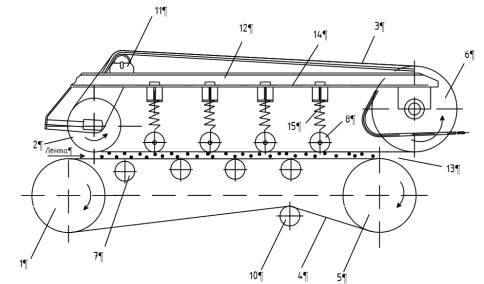 Рис. 1. Схемы усовершенствованного зажимного транспортера: а – общий вид зажимного транспортера; б – вид зажимного устройства с фигурным выступом: 1, 2 – ведомые шкивы; 3 – бесконечный верхний пас; 4 – бесконечный нижний пас; 5, 6 – ведущие шкивы; 7 – опорный ролик; 8 – прижимные валки; 9 – фигурный выступ; 10, 11 – направляющие ролики; 13 – ров; 14 – пластина; 15, 16, 17 –пружины; 18 – стаканы; 19, 20, 21 – прижимные пластины; 22 – регулирующий винт; 23 – опорная пластина.