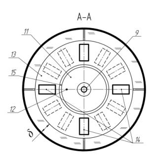 дисковими перегородками 13 з рівномірно розташованими прямокутними,
