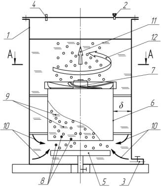аератор 5 і циркуляційна труба 6, з радіальним зазором “δ” відносно