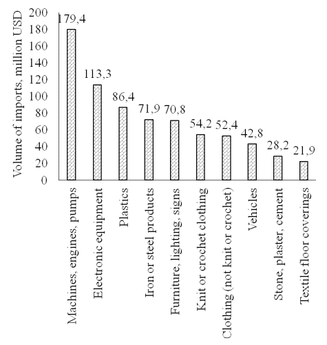 segment of imports in 2014 belongs to oil - $1.4 billion. The second place