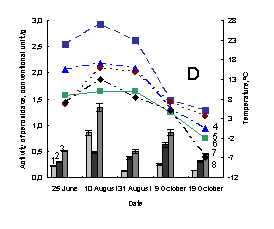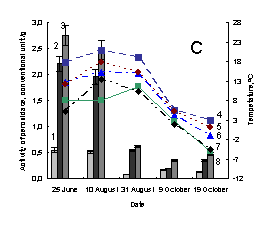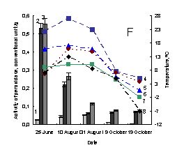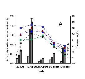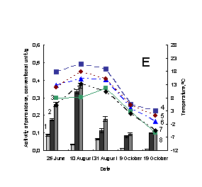 soluble peroxidase; 3 –activity of total peroxidase; 4 – minimum of air tempetature in day of sampling; 5 – soil