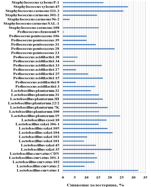 снижали холестерин от 2,8% до 24,3%, при этом штамм Lactobacillus curvatus 1 снизил содержание