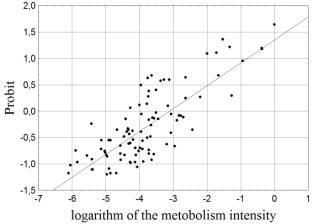 Probabilistic patterns of biodiversity for the studied biological groups. According to the collected data, we can estimate the probability distribution of the species studied. To do this, we have to use geometric probability, which is the ratio area habitat of each species to the area of the land of the earth's surface. Next, the rules of probability are sought as dependencies between geometric probabilities and various biological parameters of each group or climatic indicators of the environment. For this purpose we used a typical method of estimating the probability of events, which is widely used in biological sciences. This methodology based on the methods of probit analysis was developed in the twentieth century by the famous entomologist Chester Bliss [7]. Numerous experimental data obtained in toxicology, entomology, microbiology, ecology, etc. show that the relationship between the proportion of individuals who are observed with some of the effects, for example the negative, and the amount of exposure, such as dose, expressed in a probability curve that has an S-shape. Usually, the transformation of the curve to a straight line includes next: on the abscissa axis there are logarithms doses, and the ordinate axis - the probabilistic one, the so-called probits. In the biological sciences, and security systems, probit is determined according to the equation: