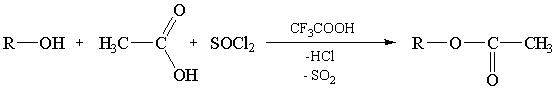 В литературе хорошо описаны способы ацетилирования древесины и её основных компонентов (целлюлозы, лигнина) ацетилхлоридом в присутствии органических оснований (аминов), связывающих выделяющийся HCl. Наряду с этим, проведённые ранее исследования показали перспективность использования в качестве ацетилирующего агента смеси «уксусная кислота – тионилхлорид». При этом реакция протекает в среде органической кислоты – трифторуксусной кислоты (ТФУК) [3].