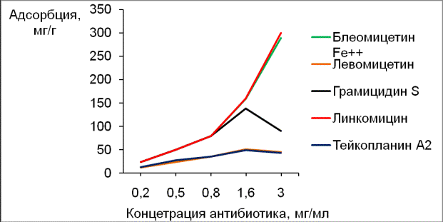В ходе работы с «Таунитом» мы провели также исследование сорбционной способности некоторых антибиотиков в зависимости от их исходной концентрации в диапазоне от 0.2 (0.5) до 3мг/мл. Количество МУНТ во всех опытах равнялось 5 мг. Исследование проводилось с антибиотиками, обладающими достаточно высоким выходом при элюции с сорбента, а именно - линкомицином, левомицетином, блеомицетином, блеомицетином-Fe2+ и грамицидином S. Полученные результаты представлены в виде изотерм адсорбции (рис.3). Как следует из графика, адсорбция всех антибиотиков первоначально возрастает и достигает своего максимума при использовании антибиотиков с исходной концентрацией 1.6 мг/мл. С увеличением концентрации антибиотика адсорбция либо снижается (у левомицетина и тейкопланина А2), либо резко падает (у грамицидина S). Интересно отметить, что у антибиотиков блеомицетина-Fe2+ и линкомицина адсорбция с ростом исходной концентрации, наоборот, существенно возрастает.