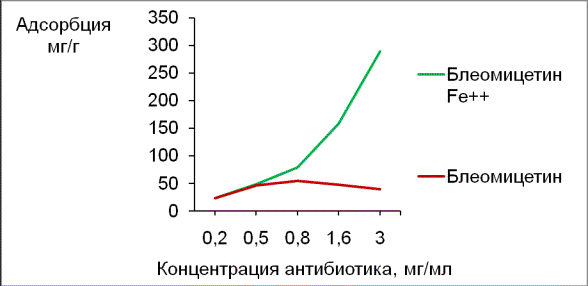 Резкое увеличение адсорбции блеомицетина-Fe2+возможно обусловлено присутствием в молекуле иона металла Fe2+, который, образуя хелатный комплекс с антибиотиком, связывает