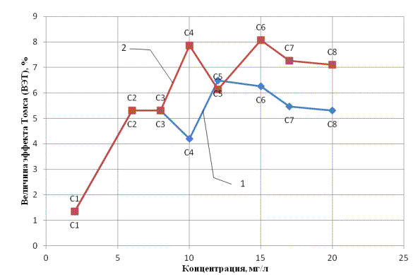 графическая зависимость величины эффекта Томса (ВЭТ) от концентрации вводимого