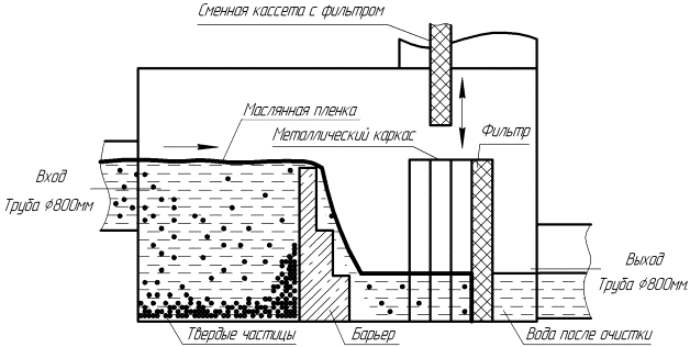 фильтрующую кассету, отделяя от жидкости нефтепродукты и взвешенные частицы. По